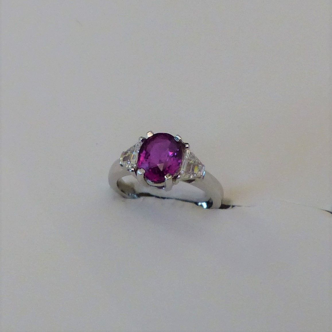 Bague or blanc Saphir rose 2cts03 de Ceylan naturel certifié GRS et diamants taille trapèze0ct46.
