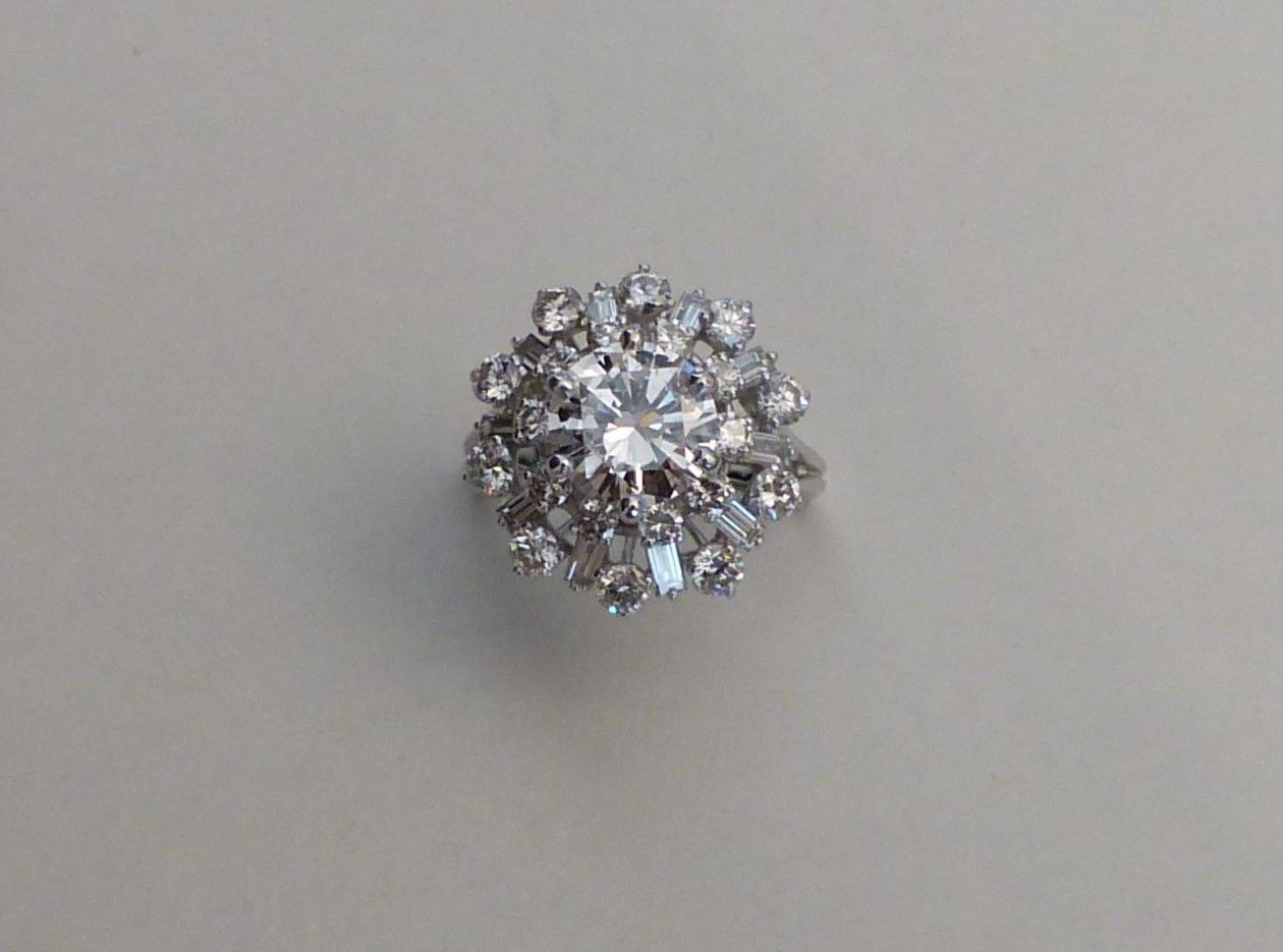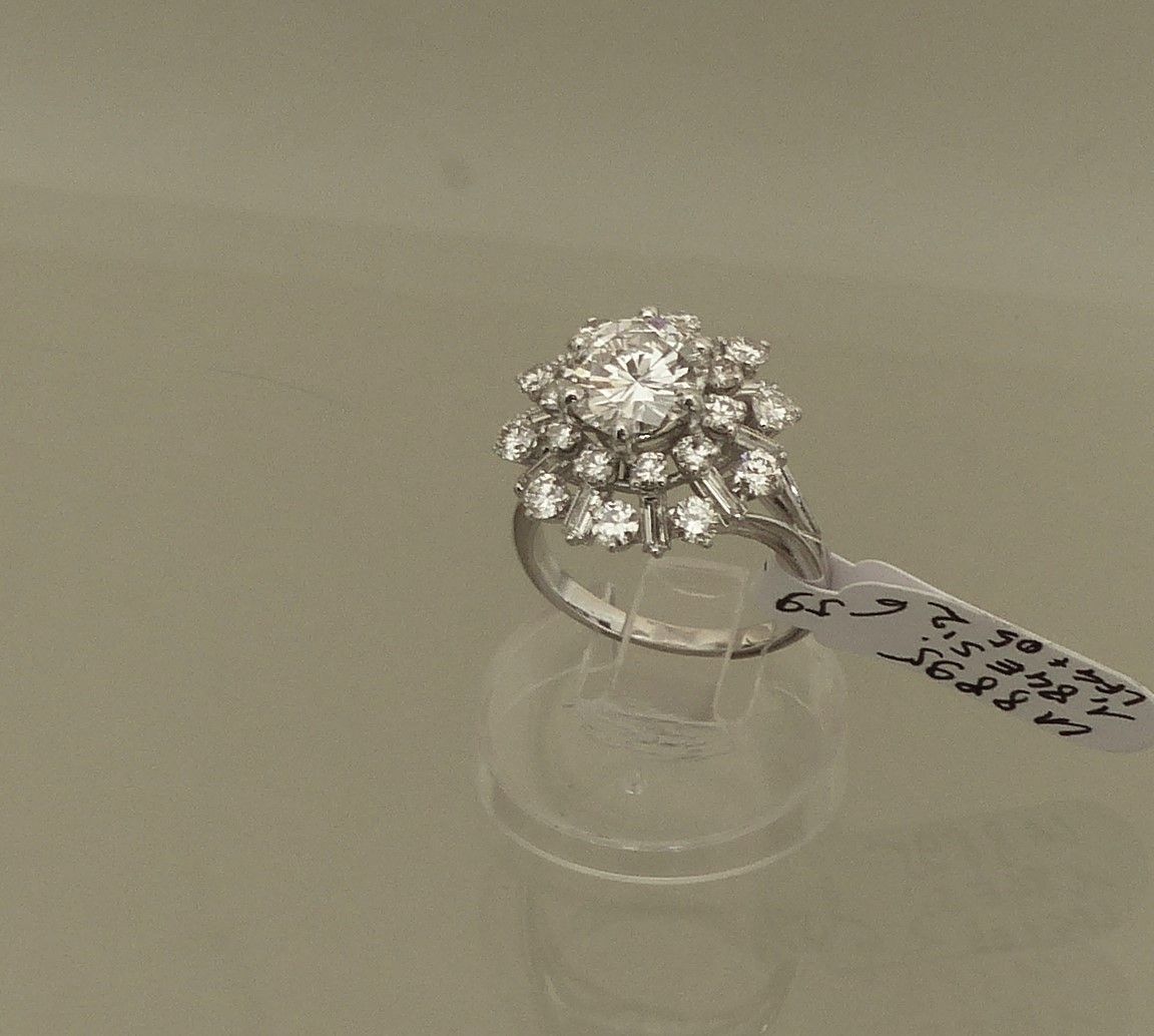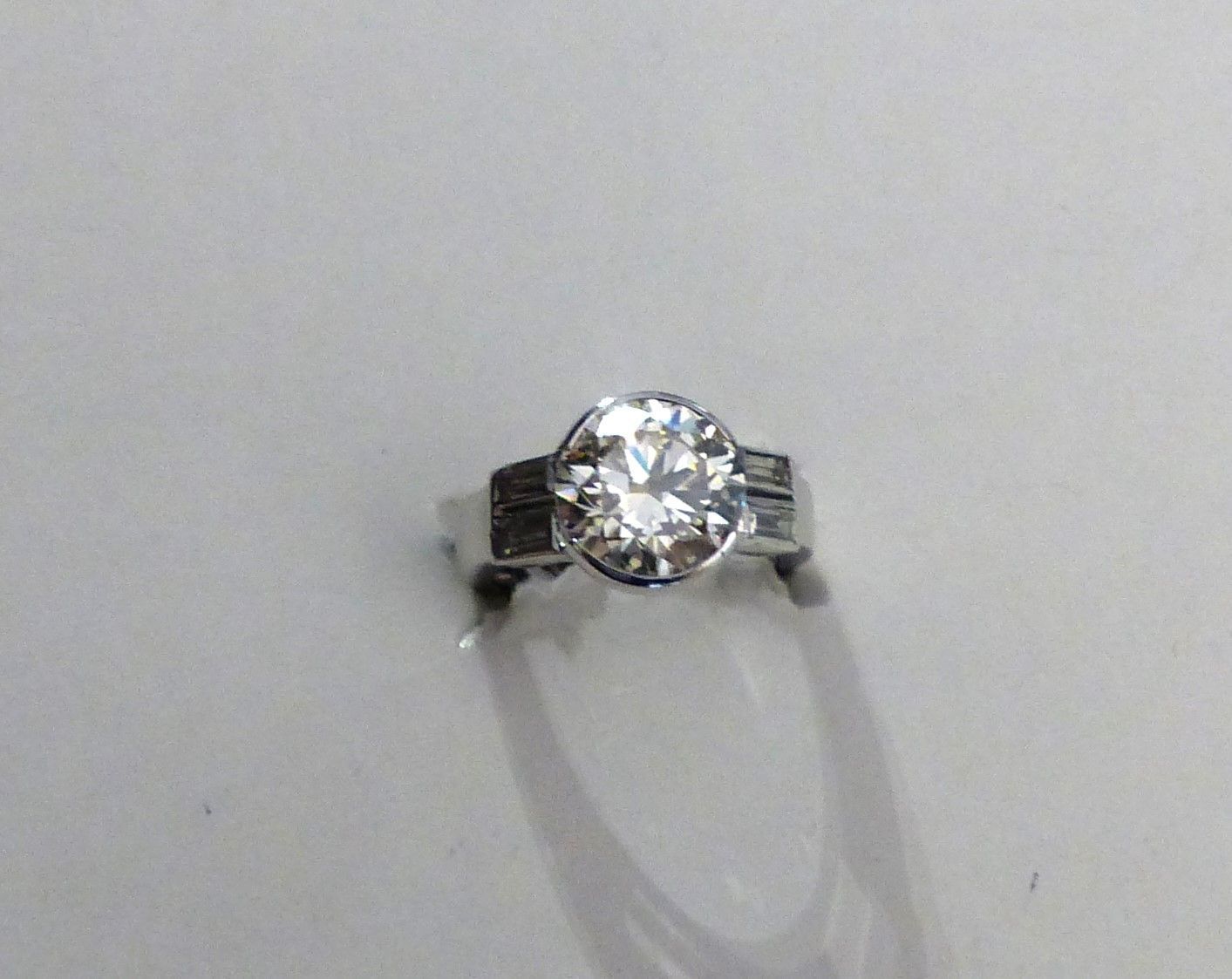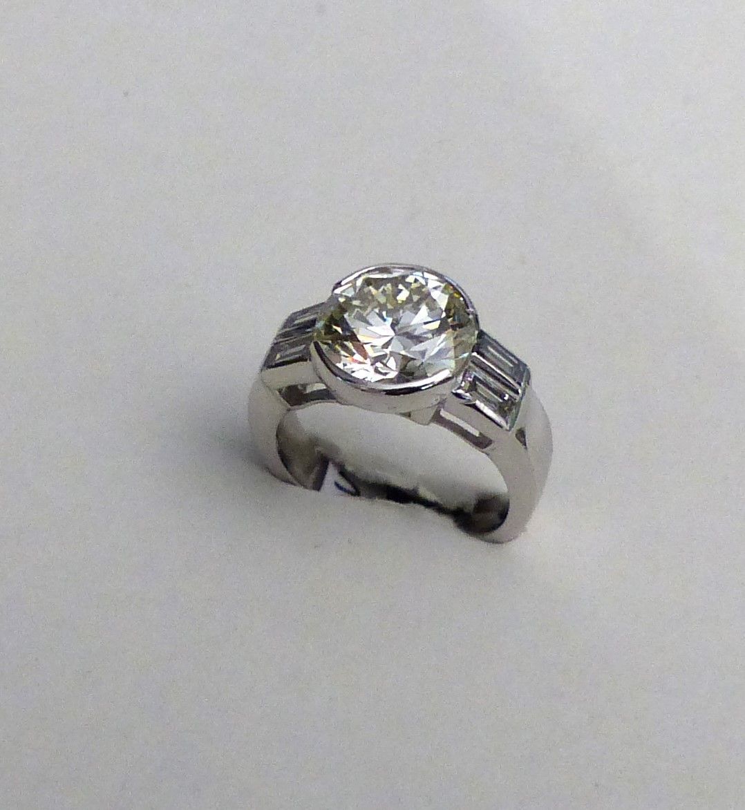 MAUBOUSSIN : bague platine diamant année 70. Au centre 4cts46 HSI2 certifié HRD et 2 diamants taille baguette pour 0ct30. Px sur demande.