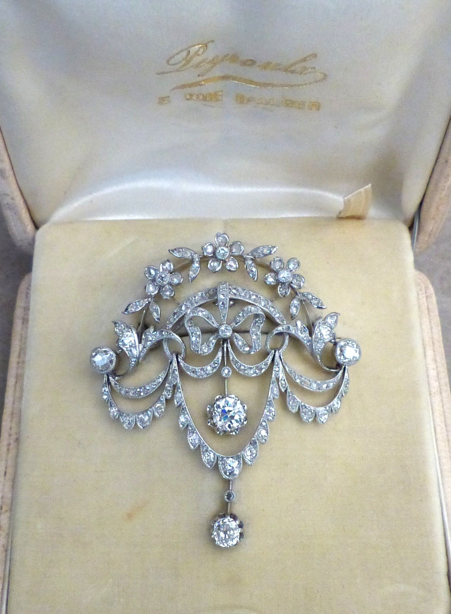 Broche platine diamants -Epoque 1900/1915. Long 8,5 cm. Poids diamants 1ct94 environ.