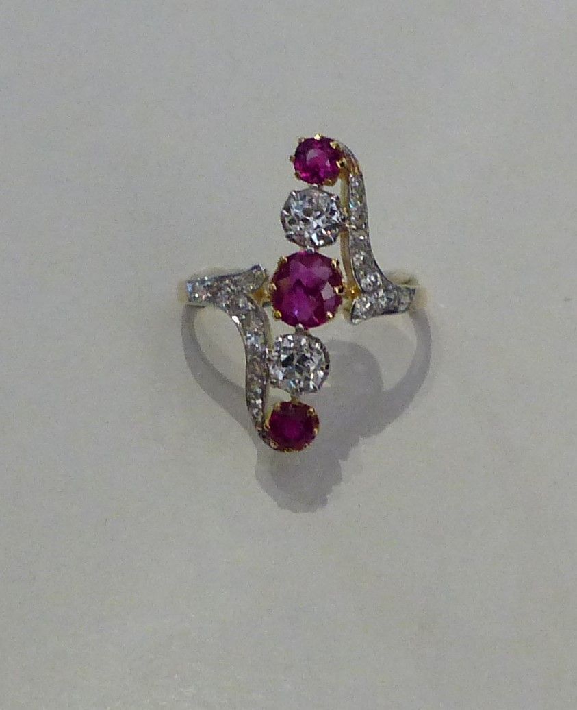 Bague "Belle Epoque" or jaune platine diamants taille ancienne et rubis BIRMANS naturels certifiés.