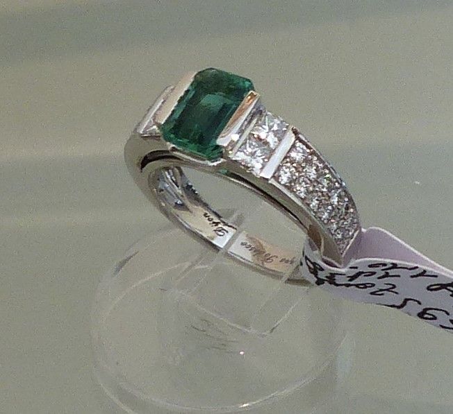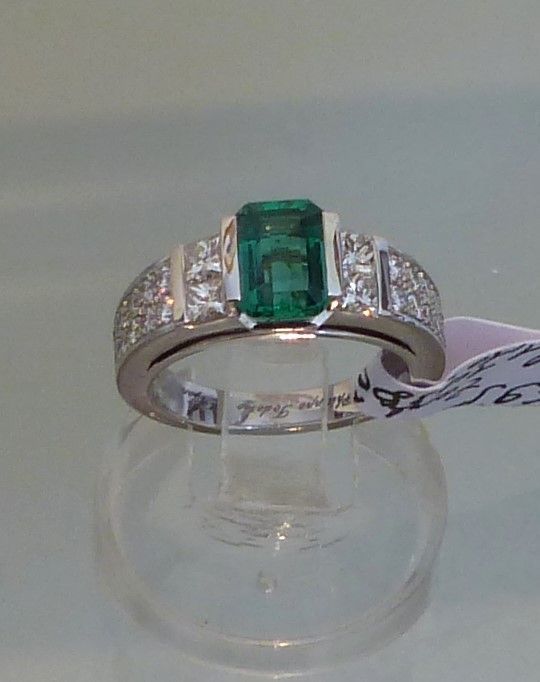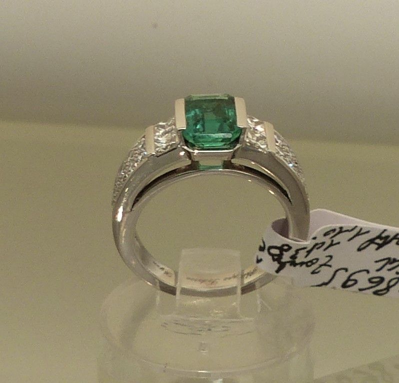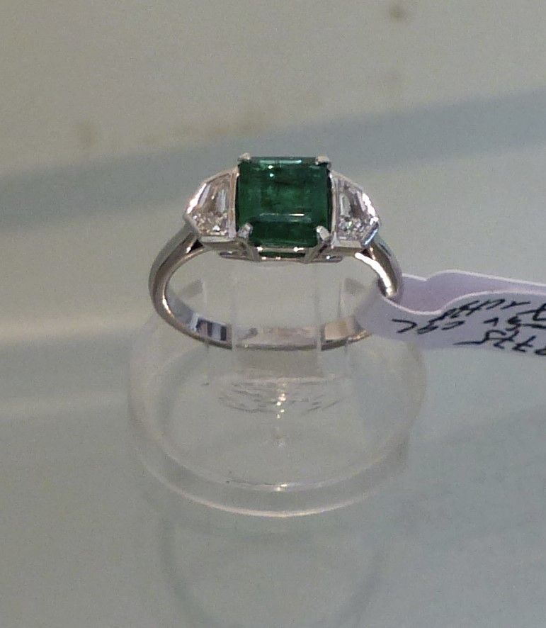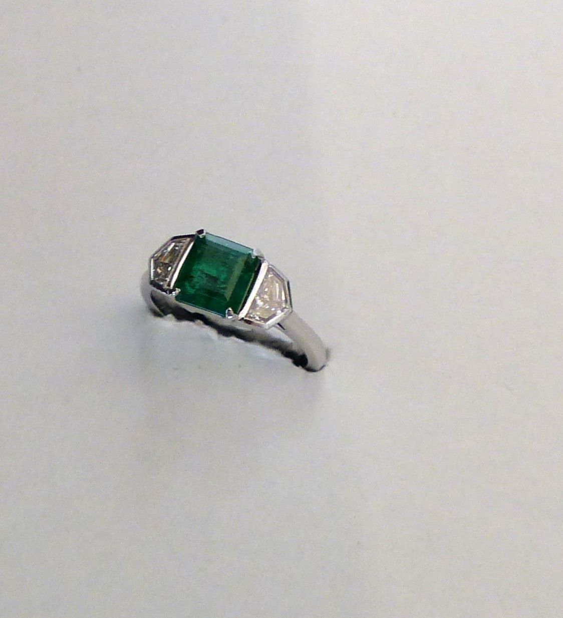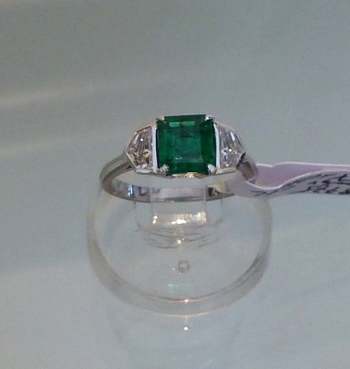 Emeraude Colombie 3cts20/3cts80 naturelle , huile mineure. Platine diamants taille baguette 1ct50.
