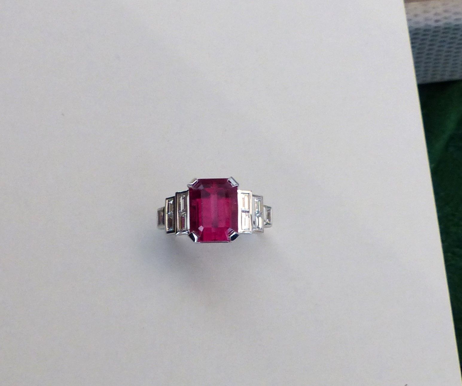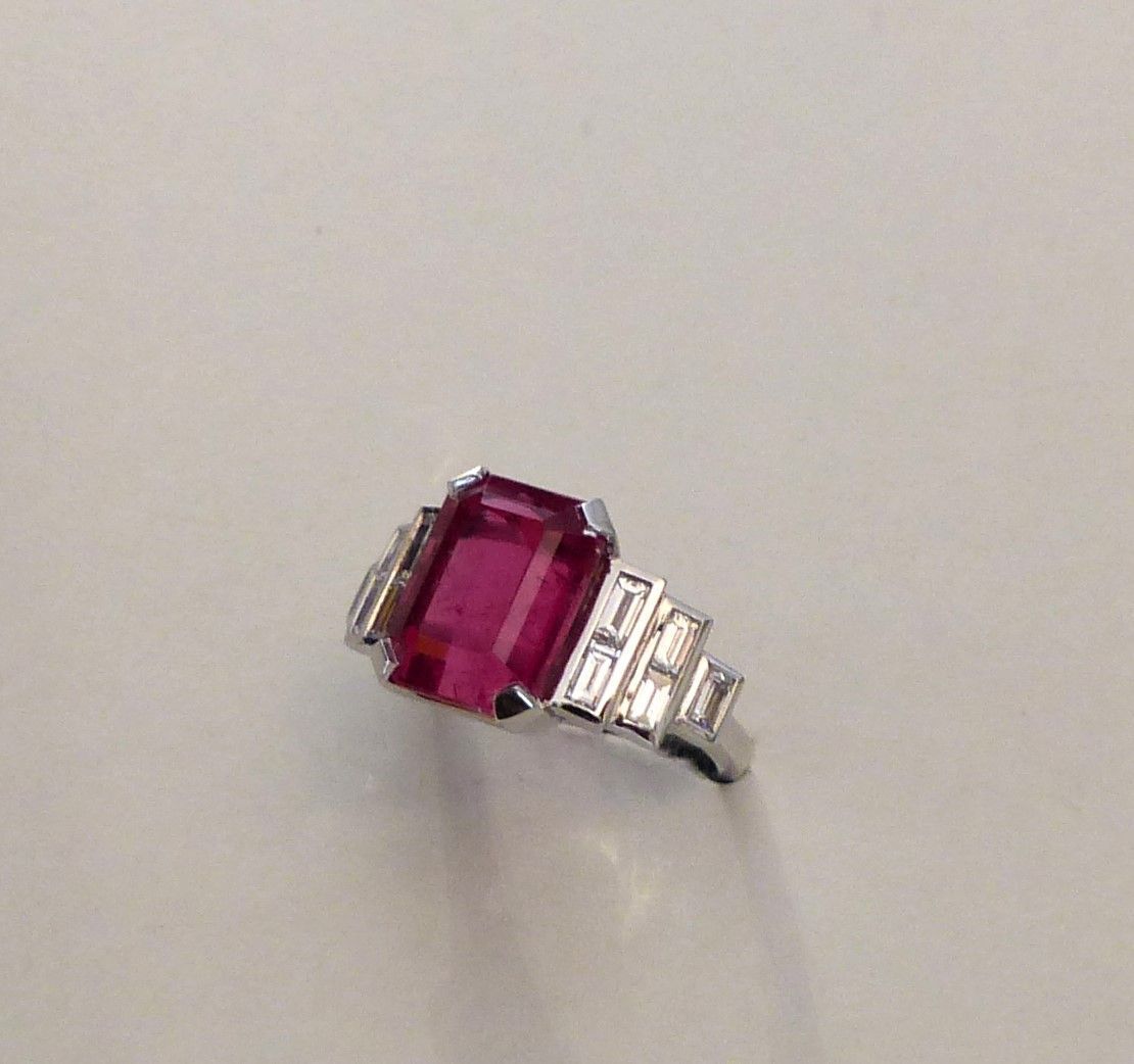 Bague or blanc Tourmaline rubellite Brésil naturelle rose intense 6cts55 et diamants baguette. Px: 17 000 euros.