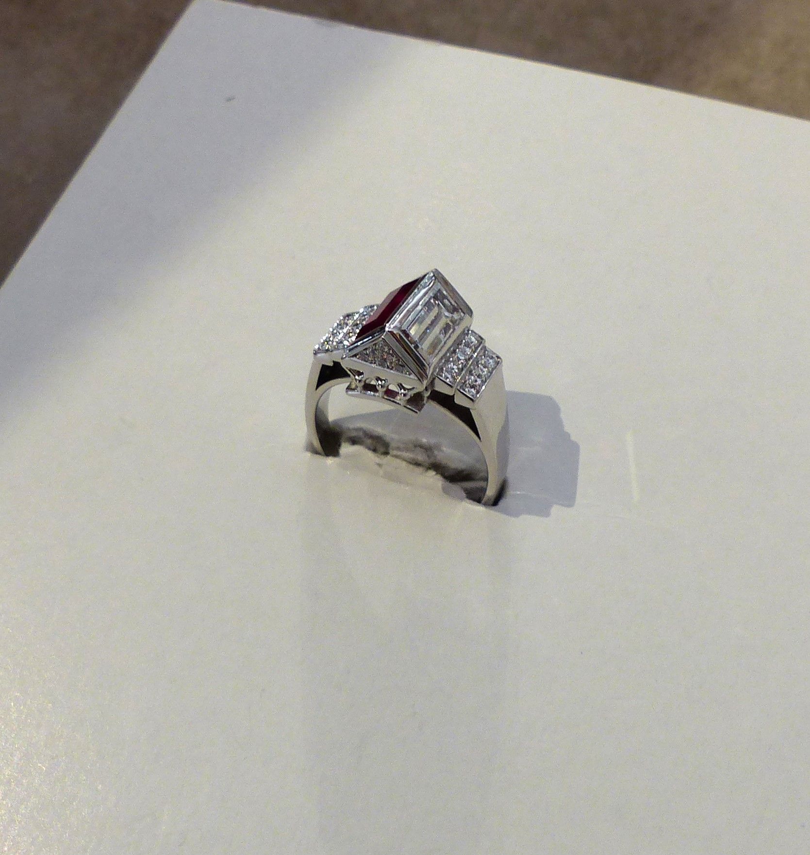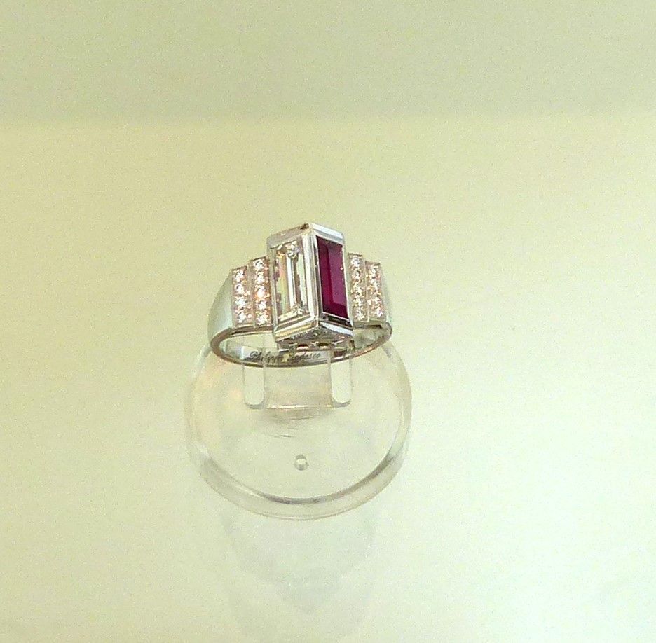 Bague or blanc " rare" arche d'Alliance. Diamant 1 ct F taille baguette et Rubis Birman 1ct02 taille baguette et diamants taille brillant. Modèle unique. Px: 17 500 e.