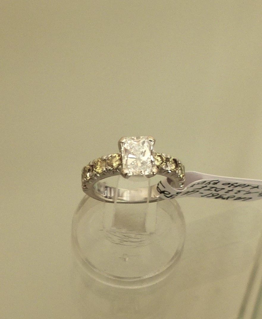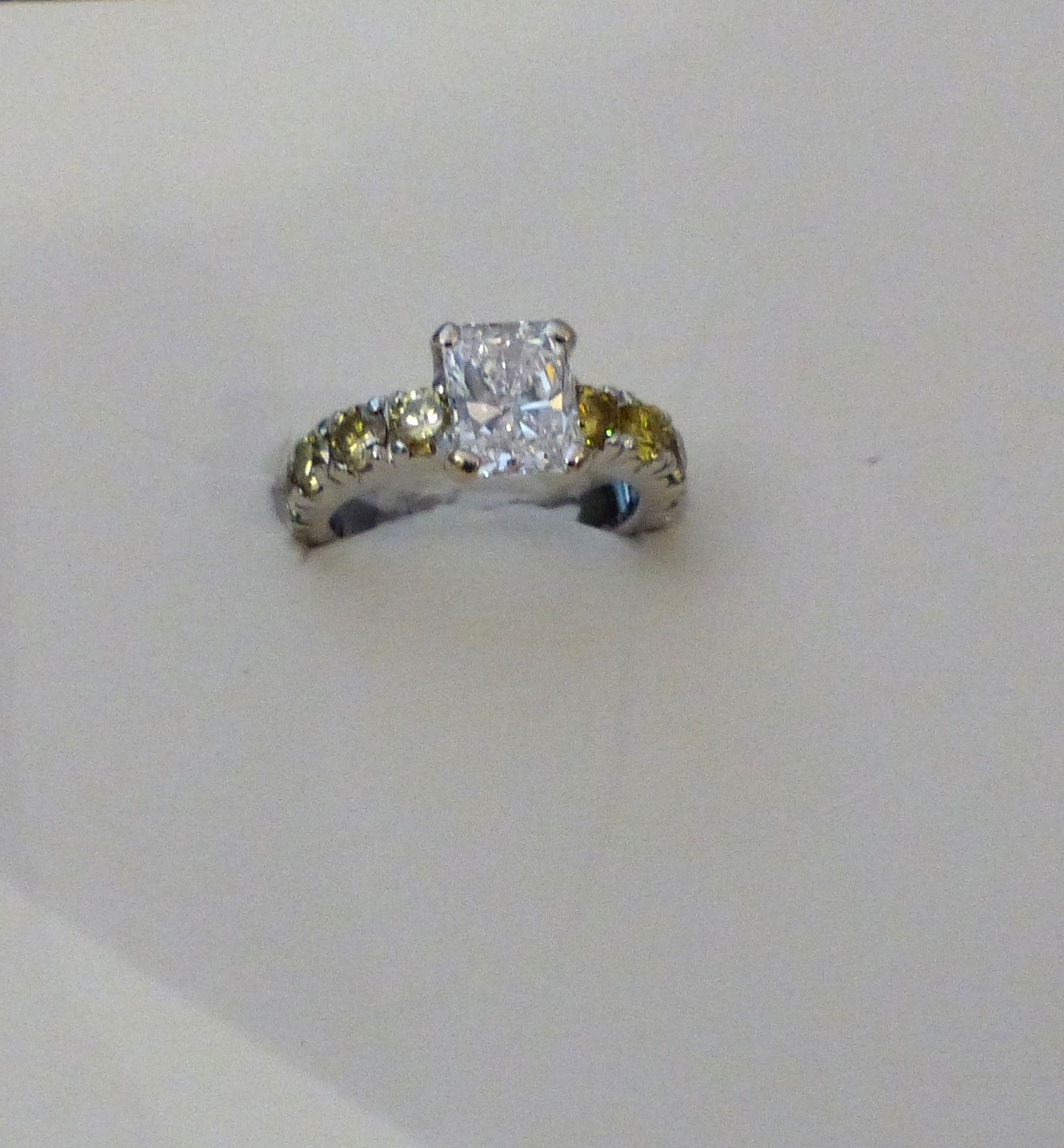 Bague or blanc diamant taille radian 1ct37 D IF certifié GIA et diamants fancy yellow sur le corps de bague.