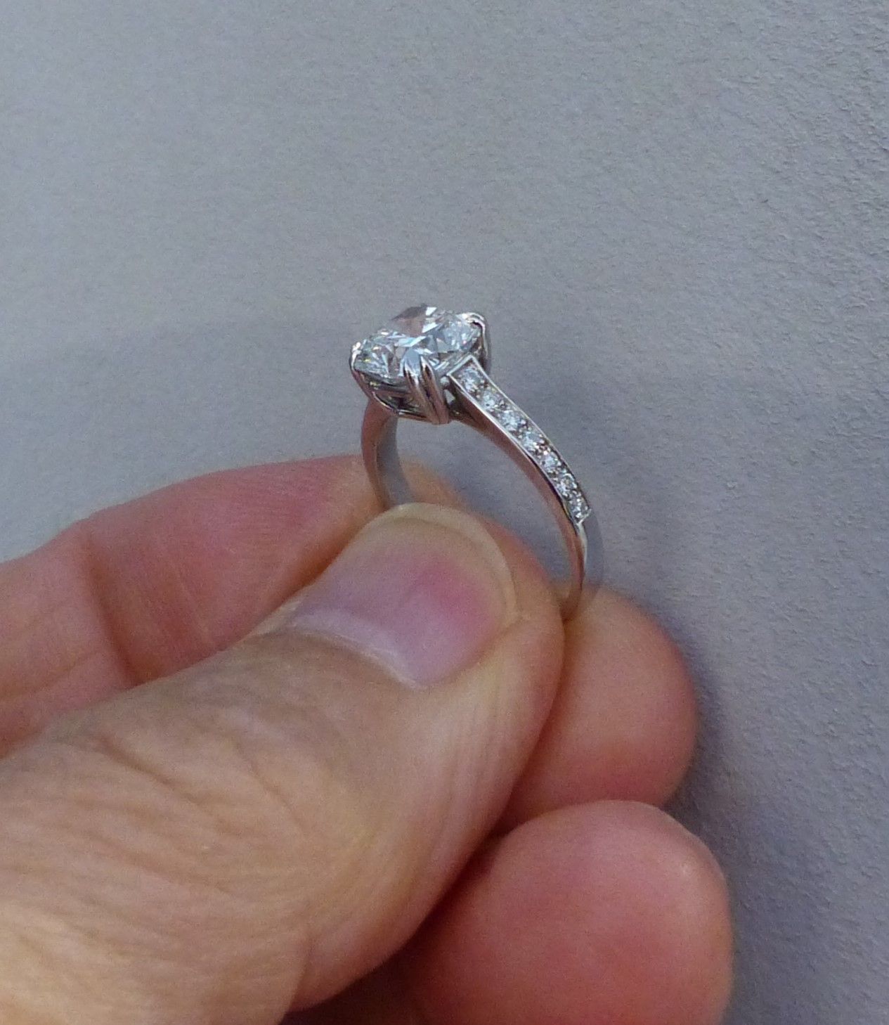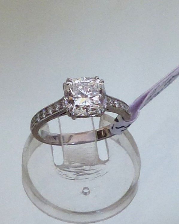 Bague or blanc diamant taille coussin 2cts09 ESi1 et diamants d'épaulement. Px: 34000 euros.