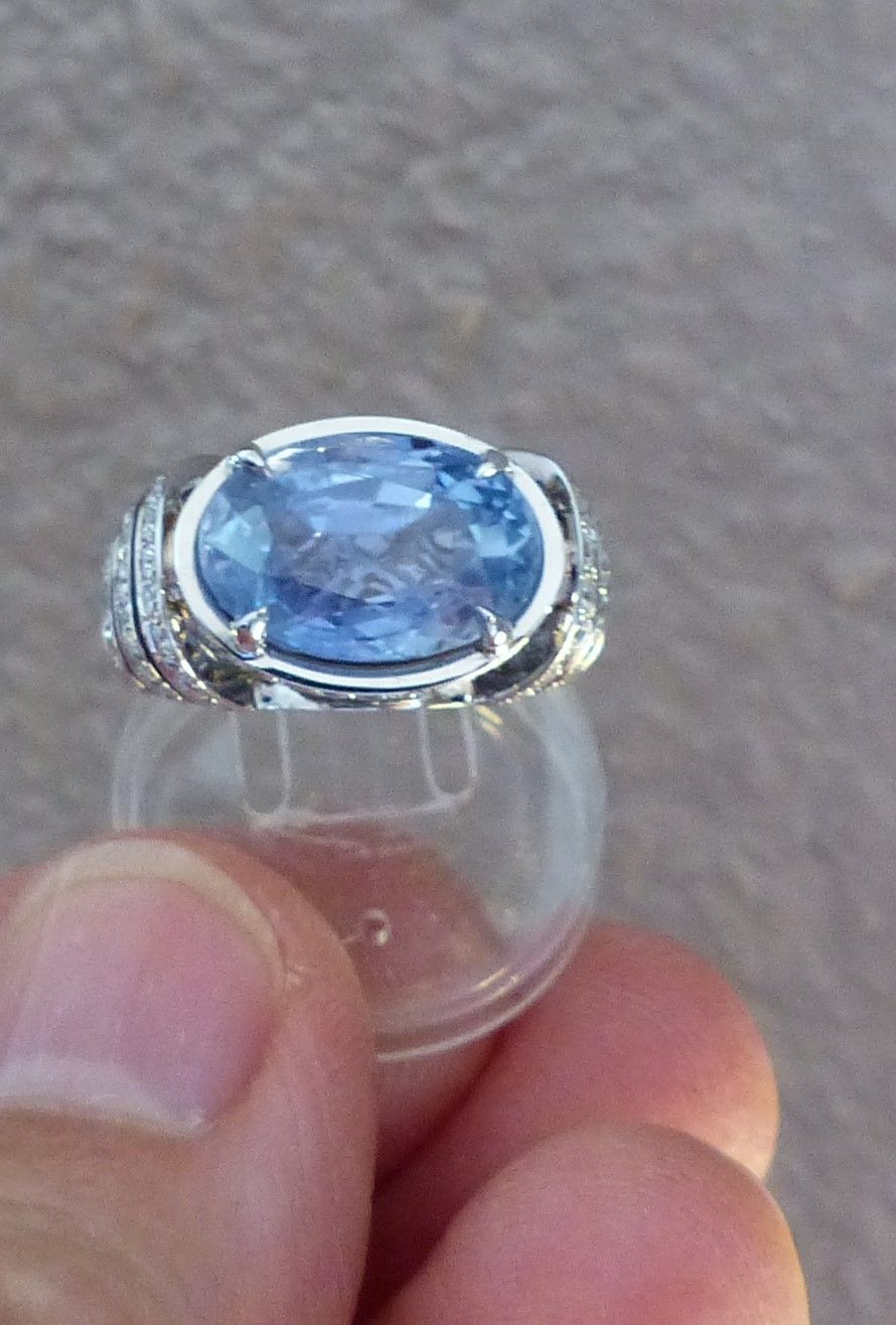 Bague or blanc Saphir 8cts39 de Ceylan naturel certifié CGL et diamants. Px: 25000 euros.