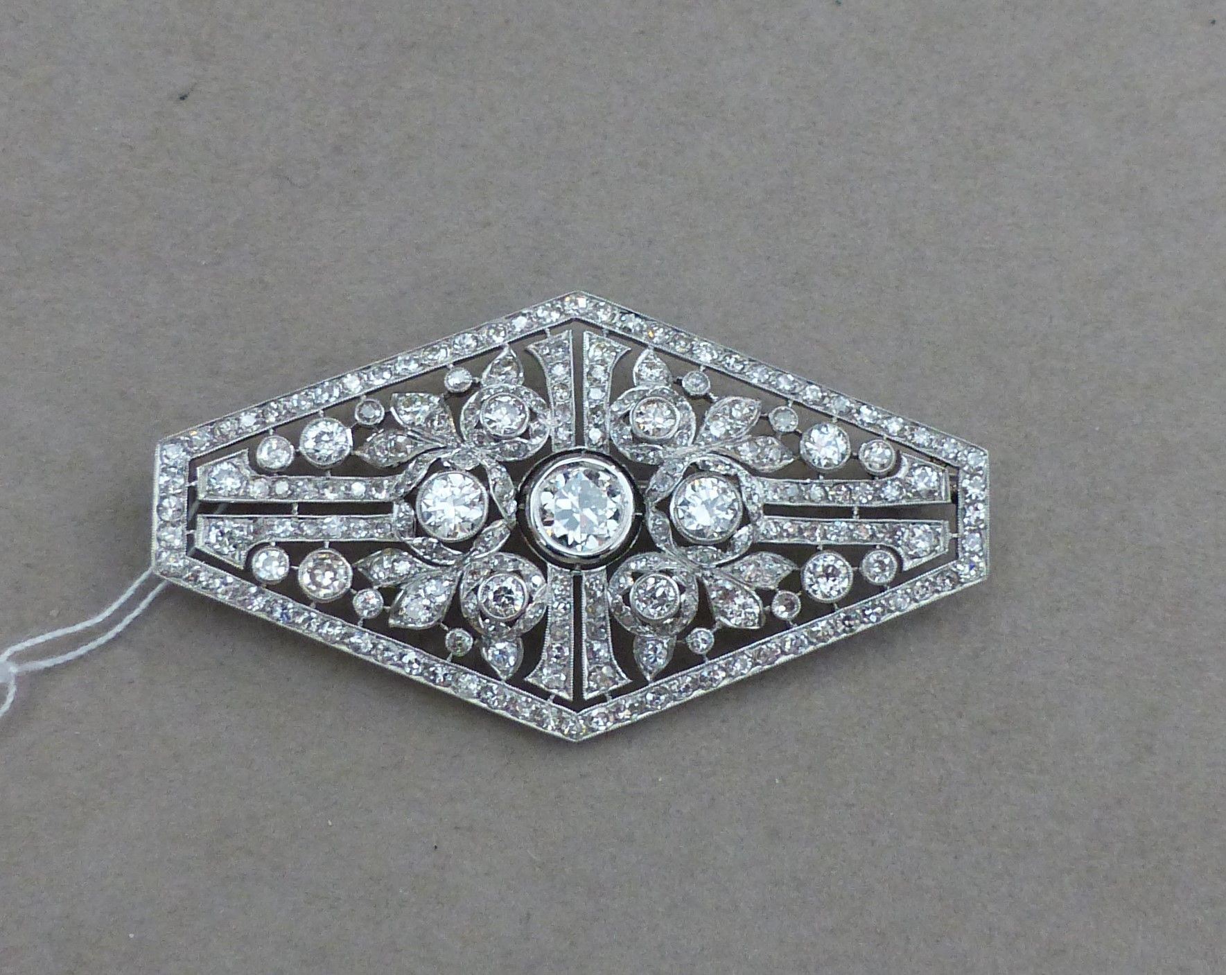 Très belle broche plaque sertie de diamants -Epoque 1920/1925. Au centre dt 1ct30I SI1 certifié LFG.