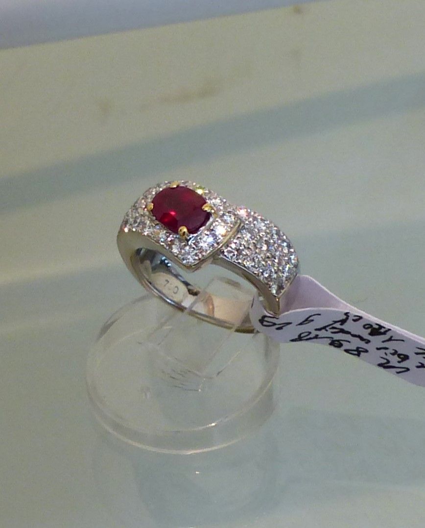 Bague bandeau or blanc Rubis birman 1ct10 certifié CGL et diamants. Px: 6850 euros.