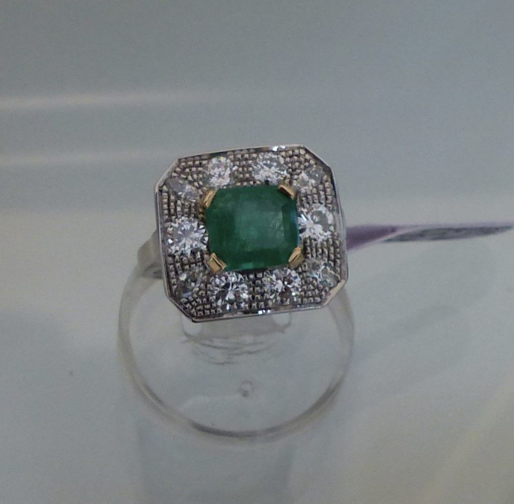 Bague or blanc émeraude ZAMBIE naturelle certifiée 1 ct 38 époque Art Déco et diamants 0ct57.