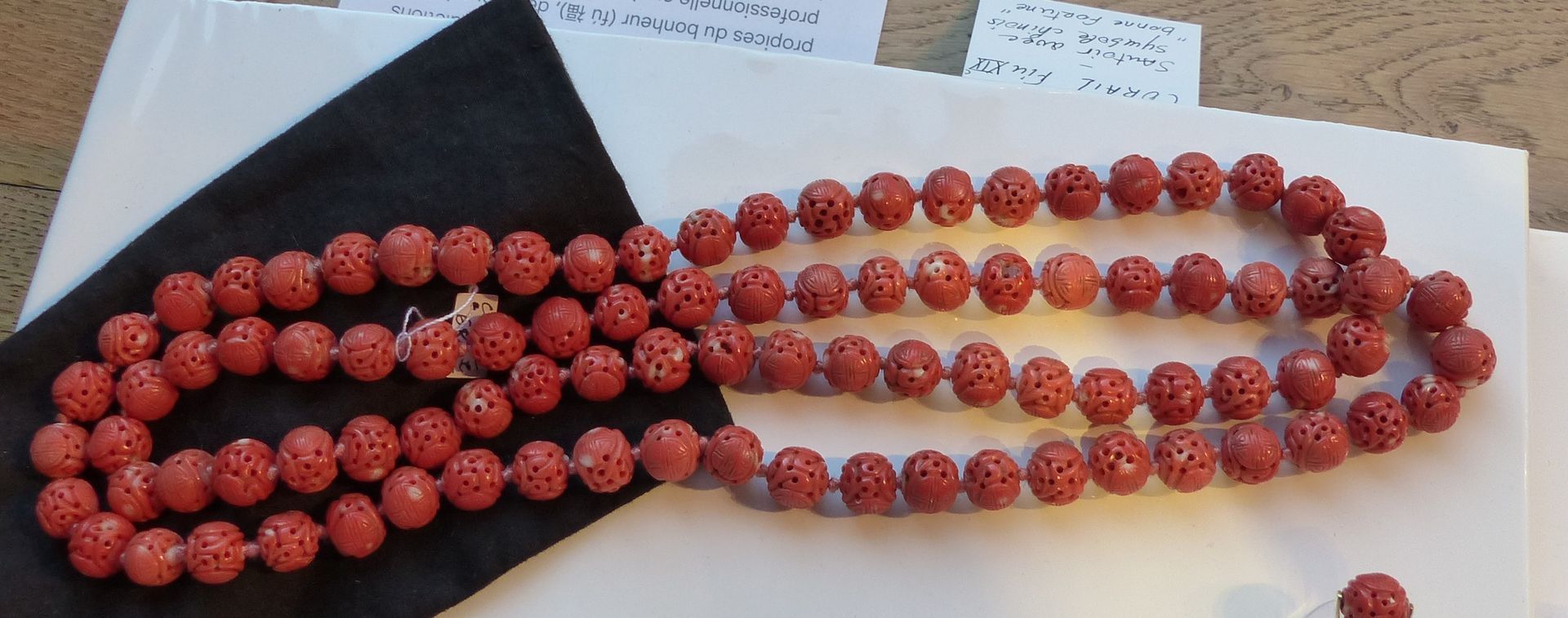 Sautoir constitué de boules de corail reperçées et sculptées de
