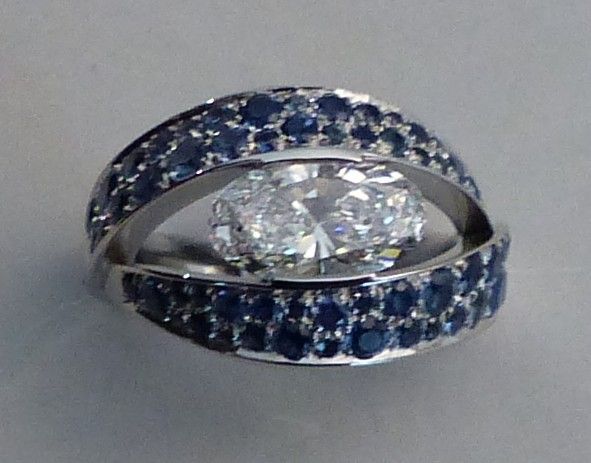 Bague boule or blanc diamant taille brillant 2cts96 MSI1 certifié LFG et saphirs 7cts32 plus petits diamants0ct45.